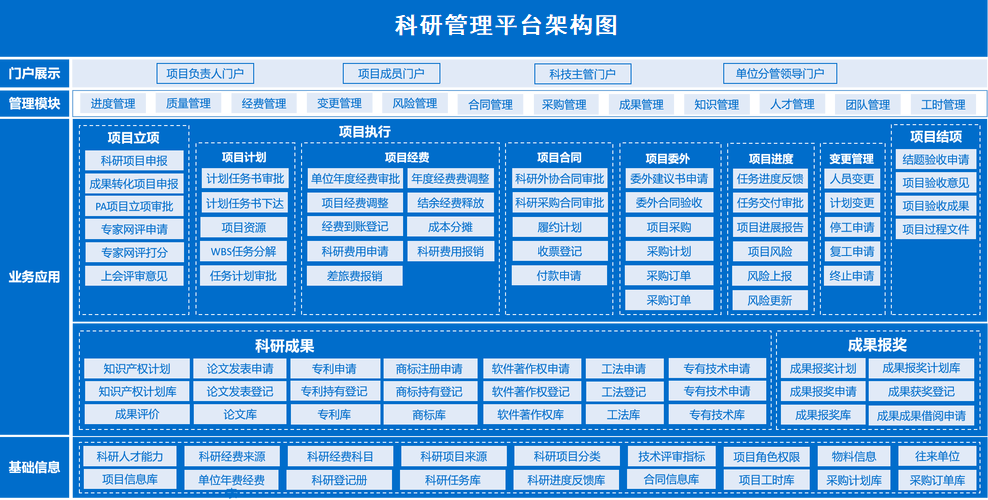 科研項目管理平台是專爲高等院校和研究機構設計開發的一套信息化管理工具,旨在全面、高效地支持和優化科研活動(dòng)的各個環節,包括科研項目的申報(bào)、立項、執行、結題、成果登記、經費使用監管以及科研人員績效考核等。